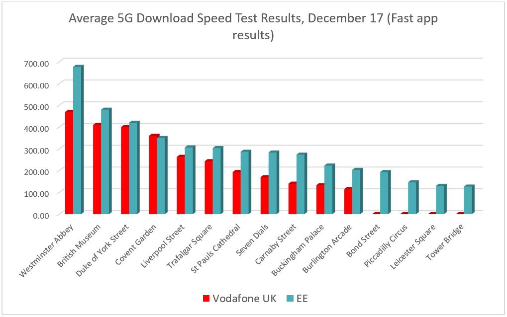 The average download speed for EE across the total 15 locations over the course of the same weekday was 294 Mbps, with 263Mpbs for Vodafone.