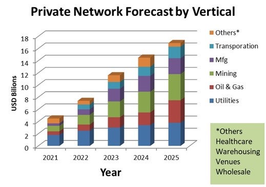 Market forecasts paint a rosy future for private networks, prompting vendors to step up with tailored solutions, in most cases different than those deployed by large telcos. Network operators view the private networks opportunity as a way to increase their market appeal by offering flexible and high value services to enterprises that will greatly increase their revenues and profitability. Private Networks represents one of the highest networking growth sectors with multiple forecasts pointing to be an aggregate $60 billion industry over the next five years. (e.g., GSMA, 5G Americas, others). The market is being driven by demands from the Utilities, Oil and Gas, and Manufacturing sectors. Few operators have launched standardized commercial B2B services, but instead are leveraging their networking and managed services capabilities to deliver customized opportunities for private 5G.