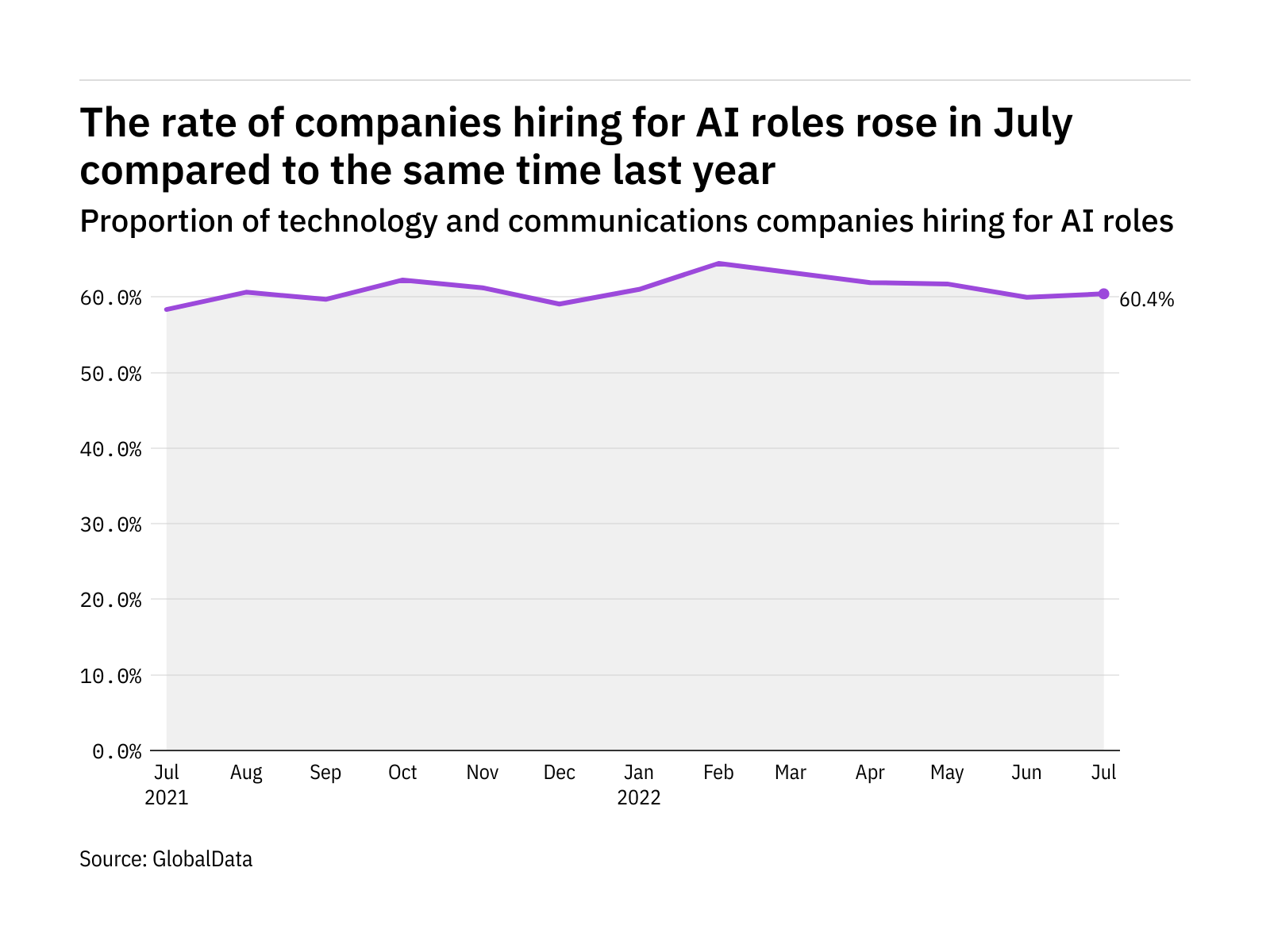 The proportion of technology and communications companies hiring for AI related positions rose in July 2022 compared with the equivalent month last year, with 60.4% of the companies included in our analysis recruiting for at least one such position.