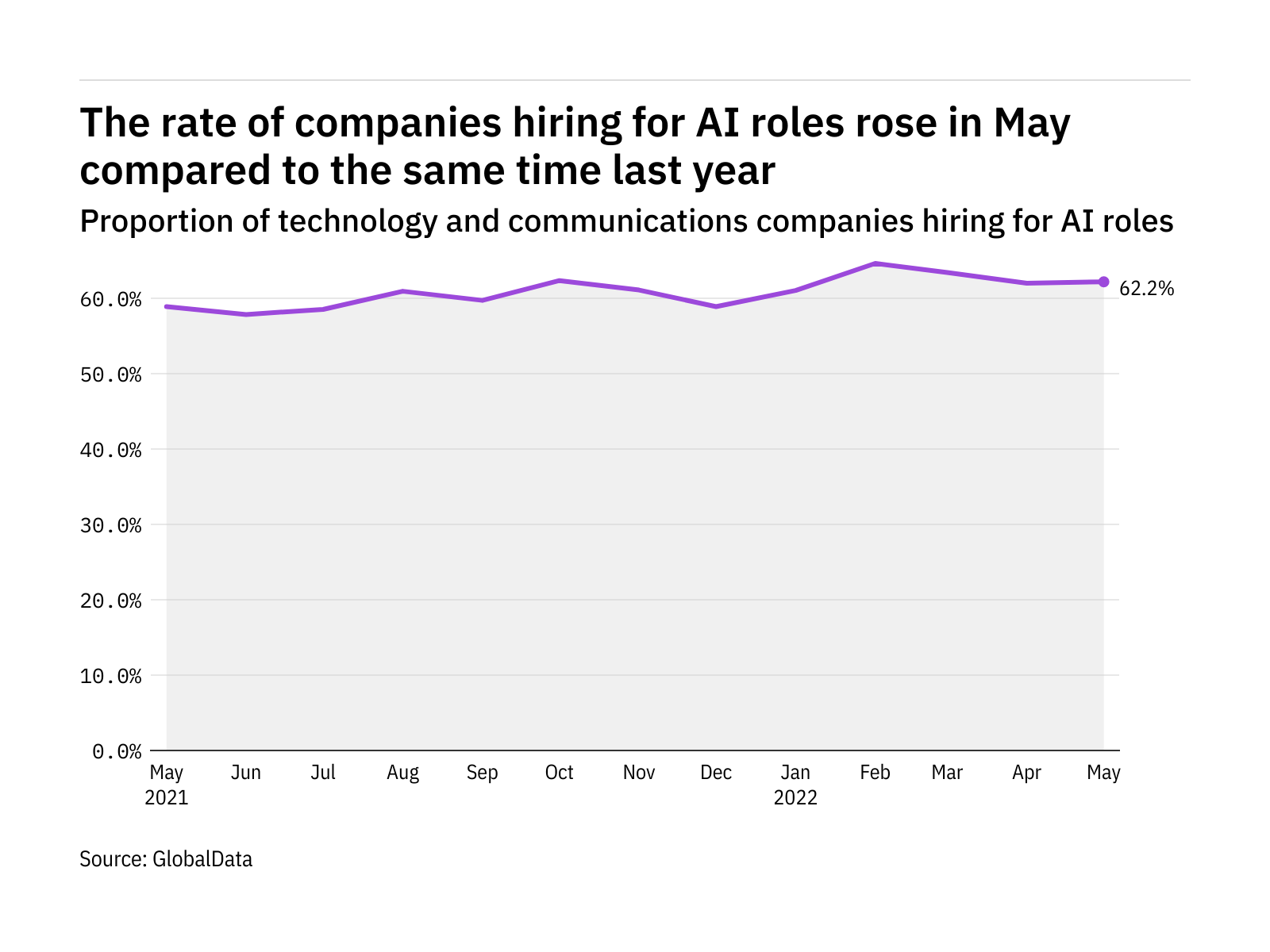 The proportion of technology and communications companies hiring for AI related positions rose in May 2022 compared with the equivalent month last year, with 62.2% of the companies included in our analysis recruiting for at least one such position.
