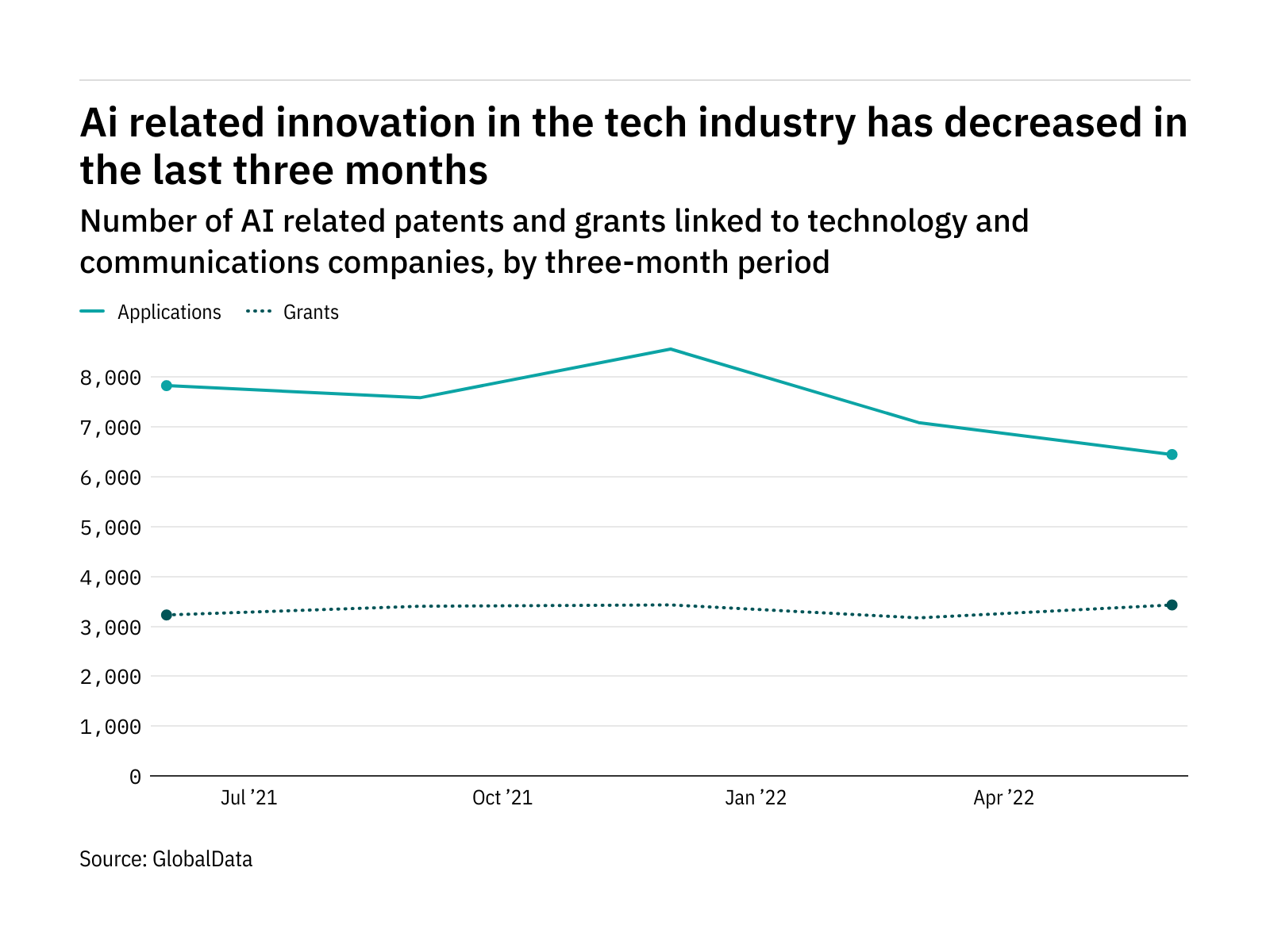 The most recent figures show that the number of AI related patent applications in the industry stood at 6449 in the three months ending June – down from 7831 over the same period in 2021.