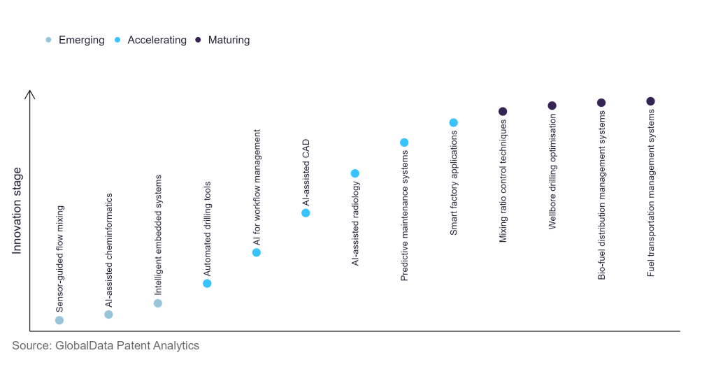Within the emerging innovation stage, sensor guided flow mixing, AI-assisted cheminformatics and intelligent embedded systems are disruptive technologies that are in the early stages of application and should be tracked closely. Automated drilling tools, AI for workflow management, and AI assisted CAD are some of the accelerating innovation areas, where adoption has been steadily increasing. Among maturing innovation areas are mixing ratio control techniques and wellbore drilling optimization, which are now well established in the industry.
