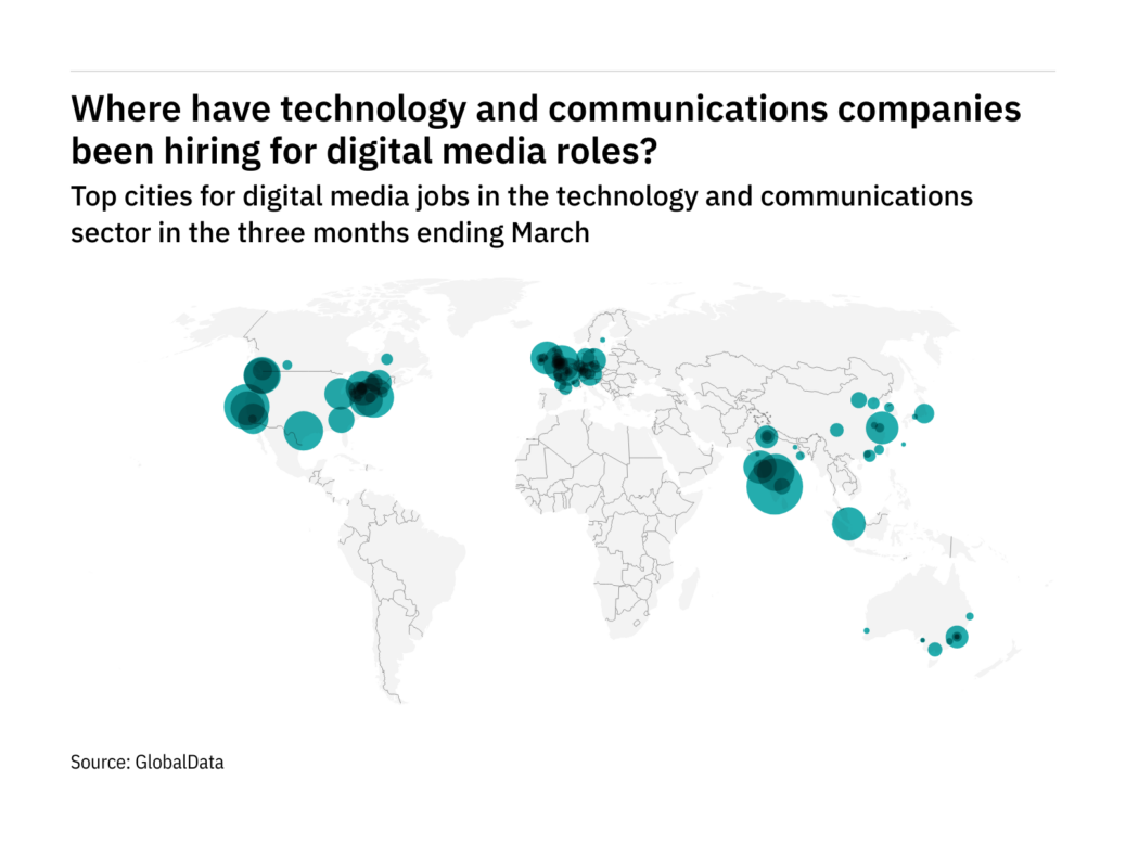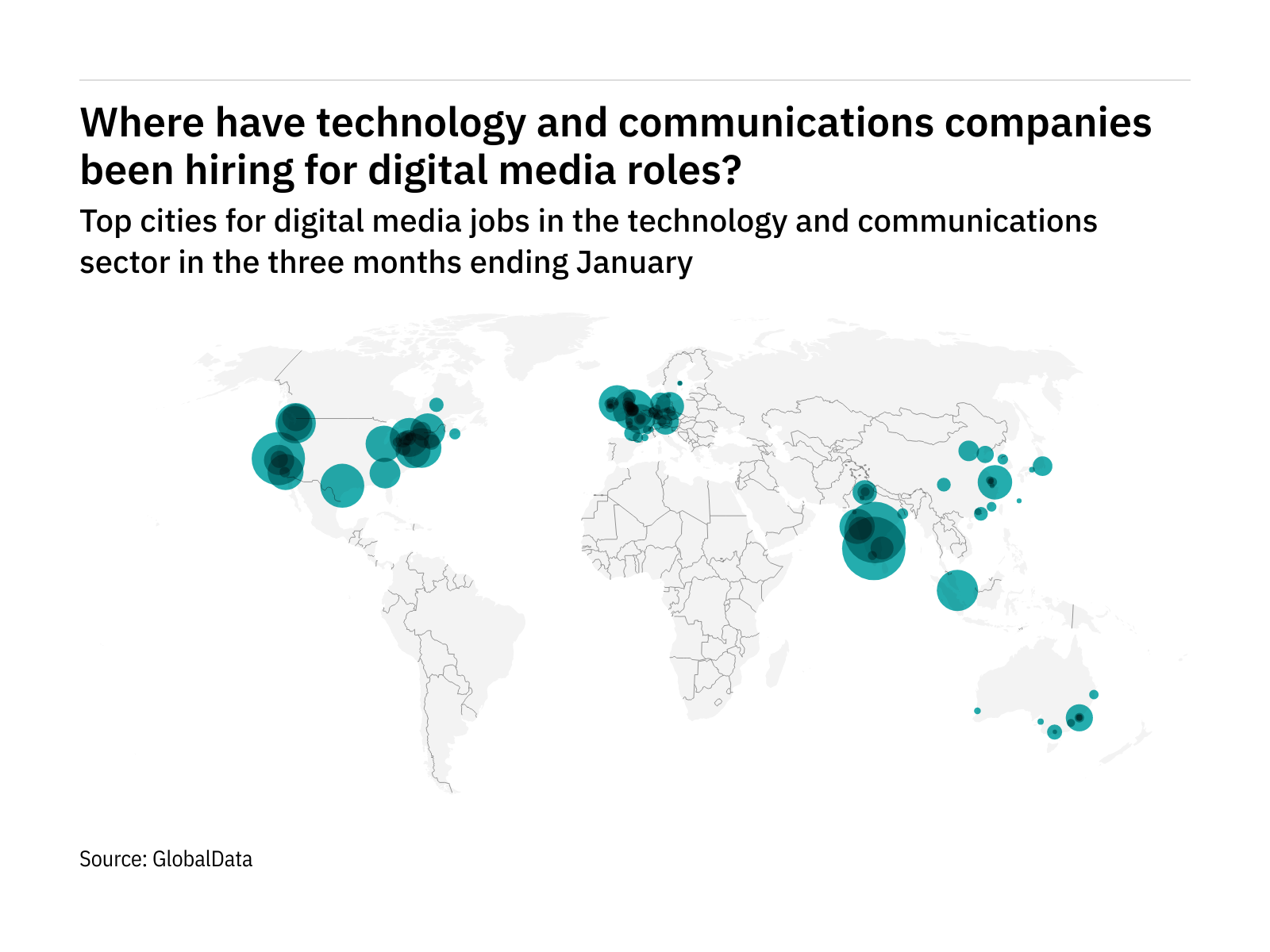 Some 4.3% of all tech industry digital media roles were advertised in Bengaluru (India) in the three months ending March.