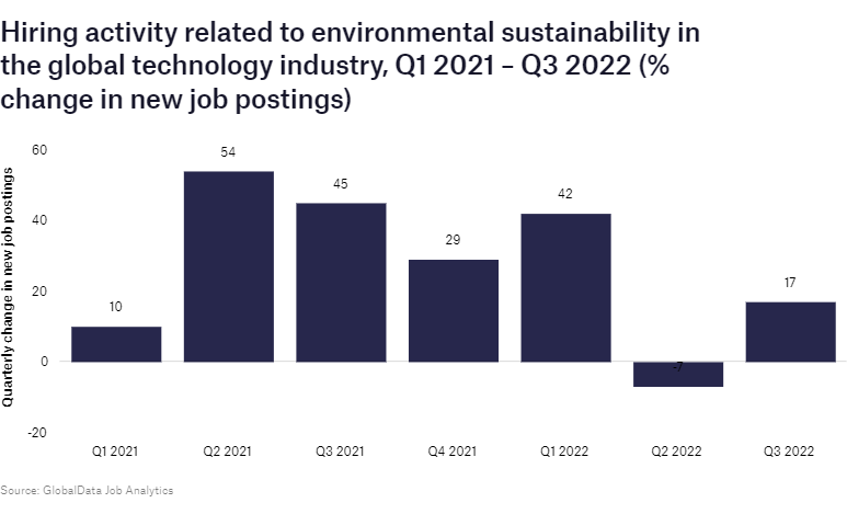 Hiring activity related to environmental sustainability increased by 17% in the technology industry in Q3 2022