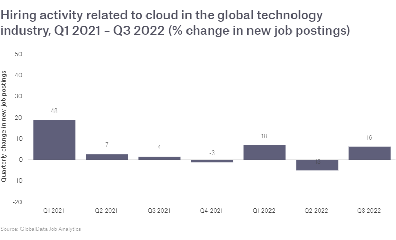 Hiring activity related to cloud decreased by 16% in the technology industry in Q3 2022