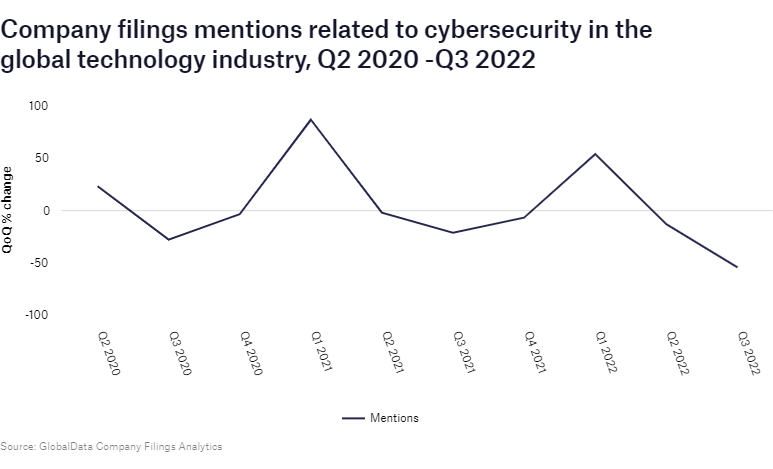 Mentions of cybersecurity decreased by 54% in the technology industry in Q3 2022