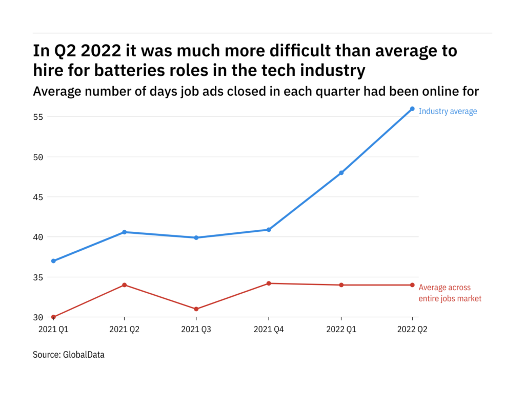 Batteries vacancies in the tech industry were the hardest tech roles to fill in Q2 2022