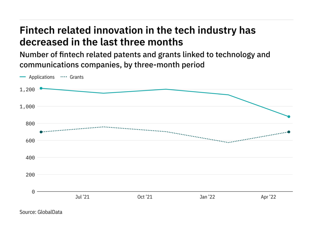 Analysis of patent filings shows a shrinking level of fintech related applications in the industry over the past year