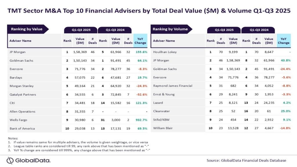 JP Morgan, Houlihan Lokey lead TMT M&A adviser rankings Q1-Q3 2025