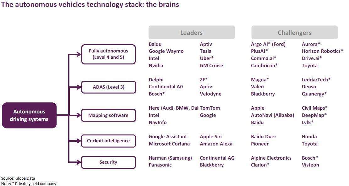 Tier-1 auto suppliers: The big auto parts suppliers own much of the intellectual property in key semi-autonomous driving technology, electronic and safety systems. The leaders are Bosch, Continental AG and Aptiv Denso, Autoliv and Magna are in strong contention.
