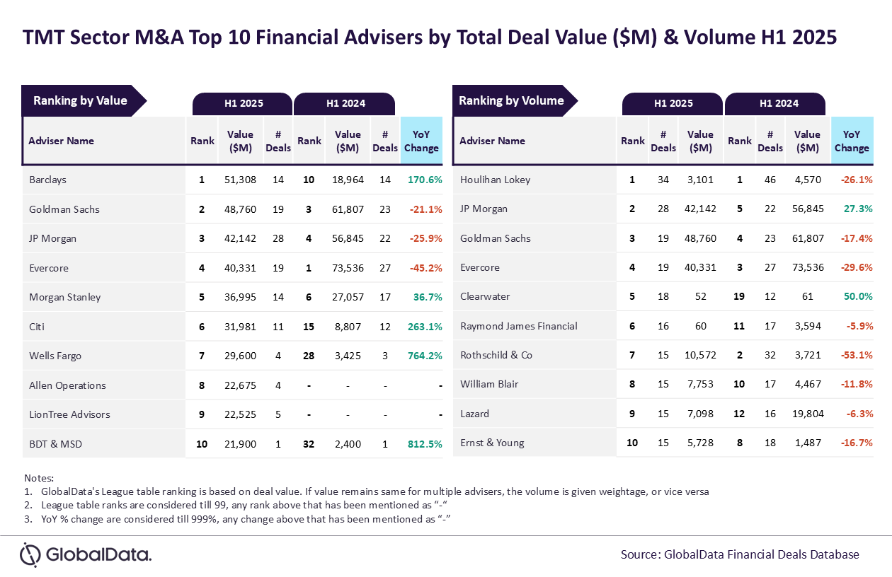 Barclays and Houlihan Lokey have emerged as the leading financial advisers in the technology, media, and telecom (TMT) sector for mergers and acquisitions (M&A) during the first half of 2025, according to data and analytics firm GlobalData’s latest league table.