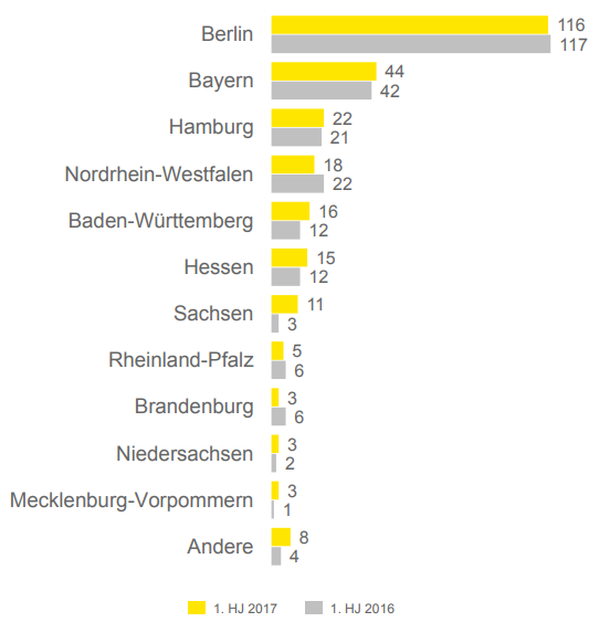 It found Berlin is the unrivalled startup capital of Germany with 44 percent of all investment deals happened in the capital — the size of Bavaria, Hamburg, North Rhine-Westphalia, Baden-Württemberg, and Hesse combined.