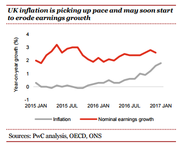 However, improvements in the job market aren’t leading to earnings growth. Last month, inflation rose to 1.8 percent, the highest rate for two-and-a-half years. “If improvements in the job market don’t start to feed through to wages, real growth earnings will be squeezed later this year and into 2018,” said Kupelian.