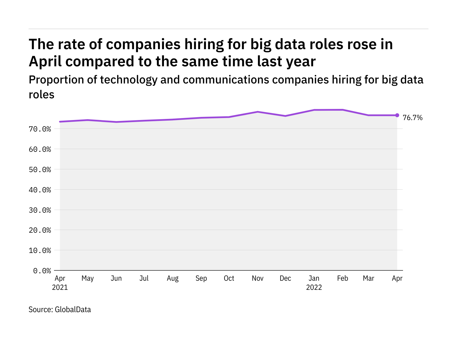The proportion of technology and communications companies hiring for big data related positions rose in April 2022 compared with the equivalent month last year, with 76.7% of the companies included in our analysis recruiting for at least one such position.