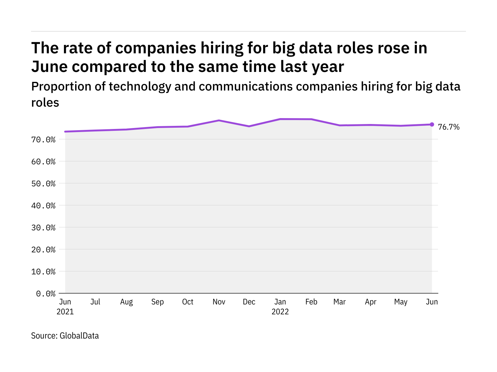 The proportion of technology and communications companies hiring for big data related positions rose in June 2022 compared with the equivalent month last year, with 76.7% of the companies included in our analysis recruiting for at least one such position.