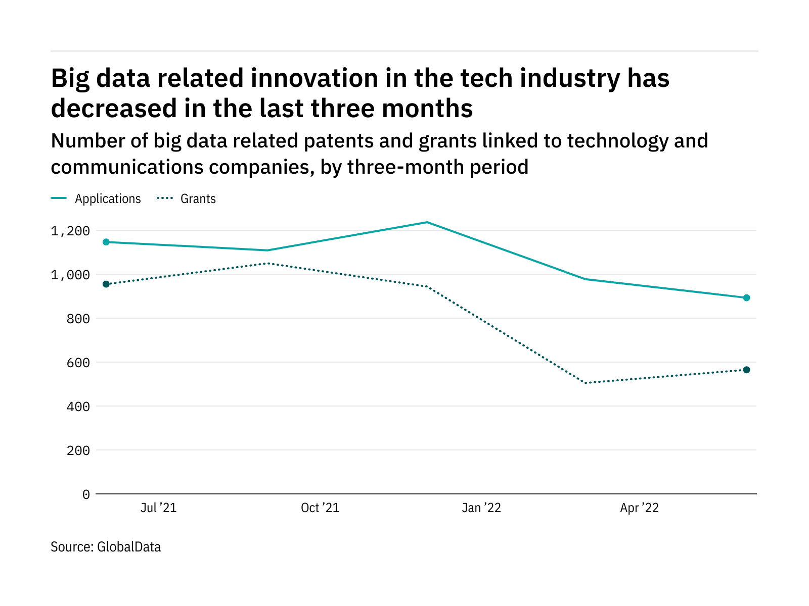 The most recent figures show that the number of big data related patent applications in the industry stood at 893 in the three months ending June – down from 1147 over the same period in 2021.