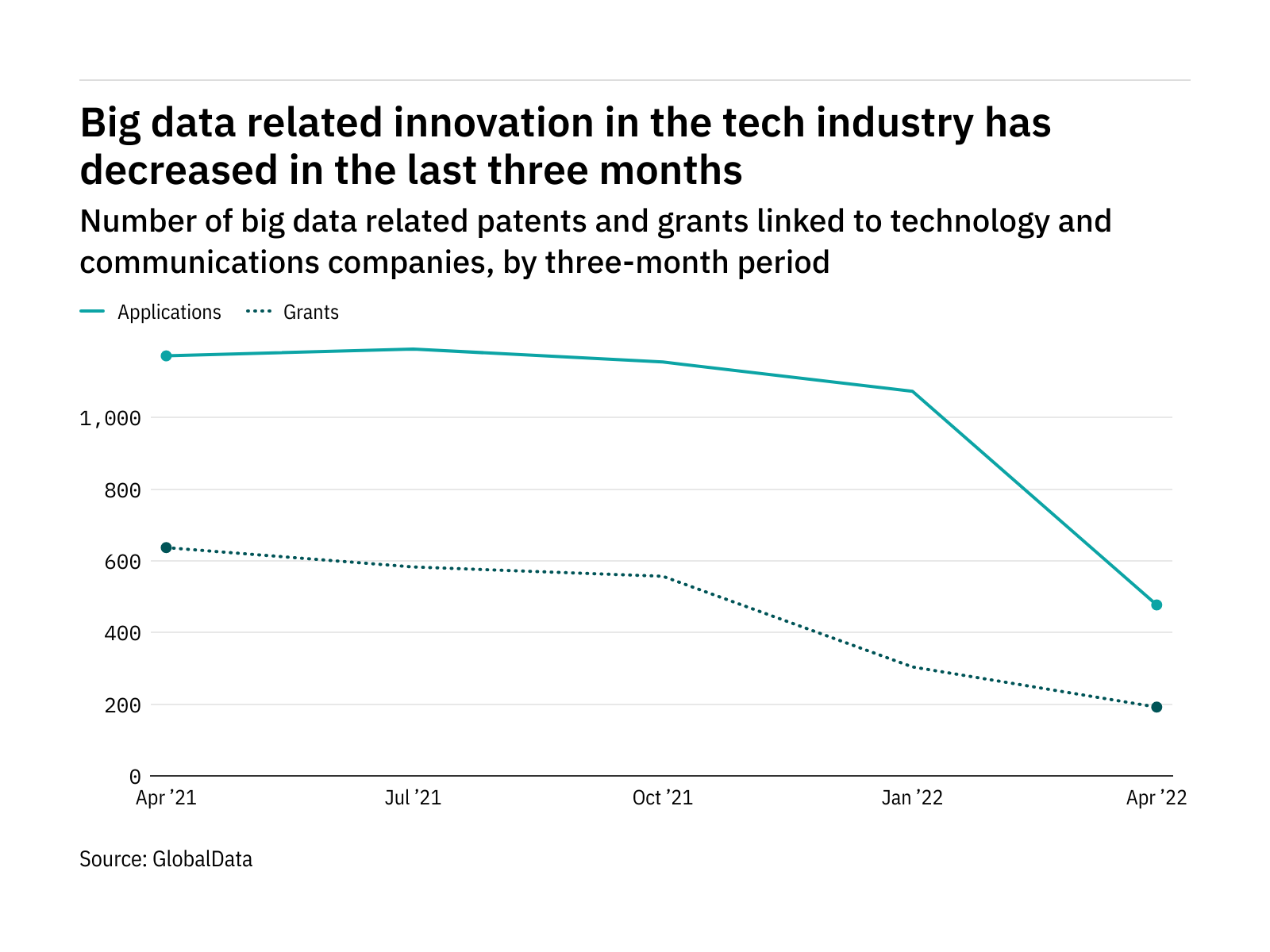 The most recent figures show that the number of big data related patent applications in the industry stood at 477 in the three months ending April – down from 1,172 over the same period in 2021.