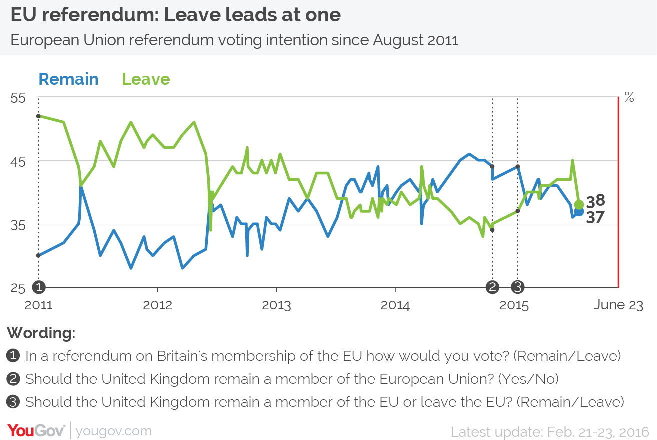 YouGov released poll figures on 24 February, so four days after Cameron announced the official referendum. At this time, Leave was actually winning the polls but only marginally.