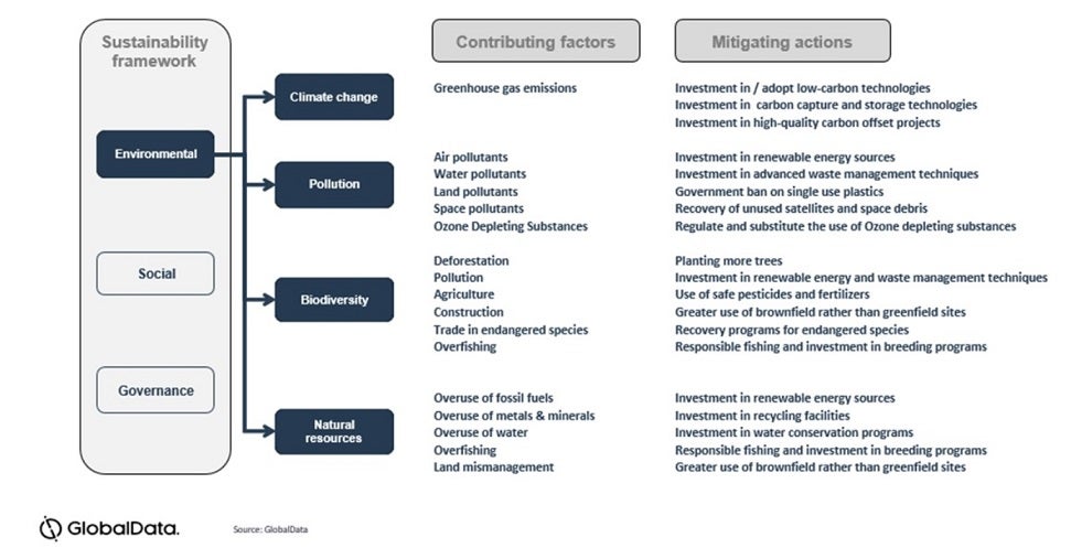 To help organizations navigate the complexities of ESG, GlobalData created a comprehensive framework which can be found in its Sustainability report. This diagram shows the environmental aspects of the framework.