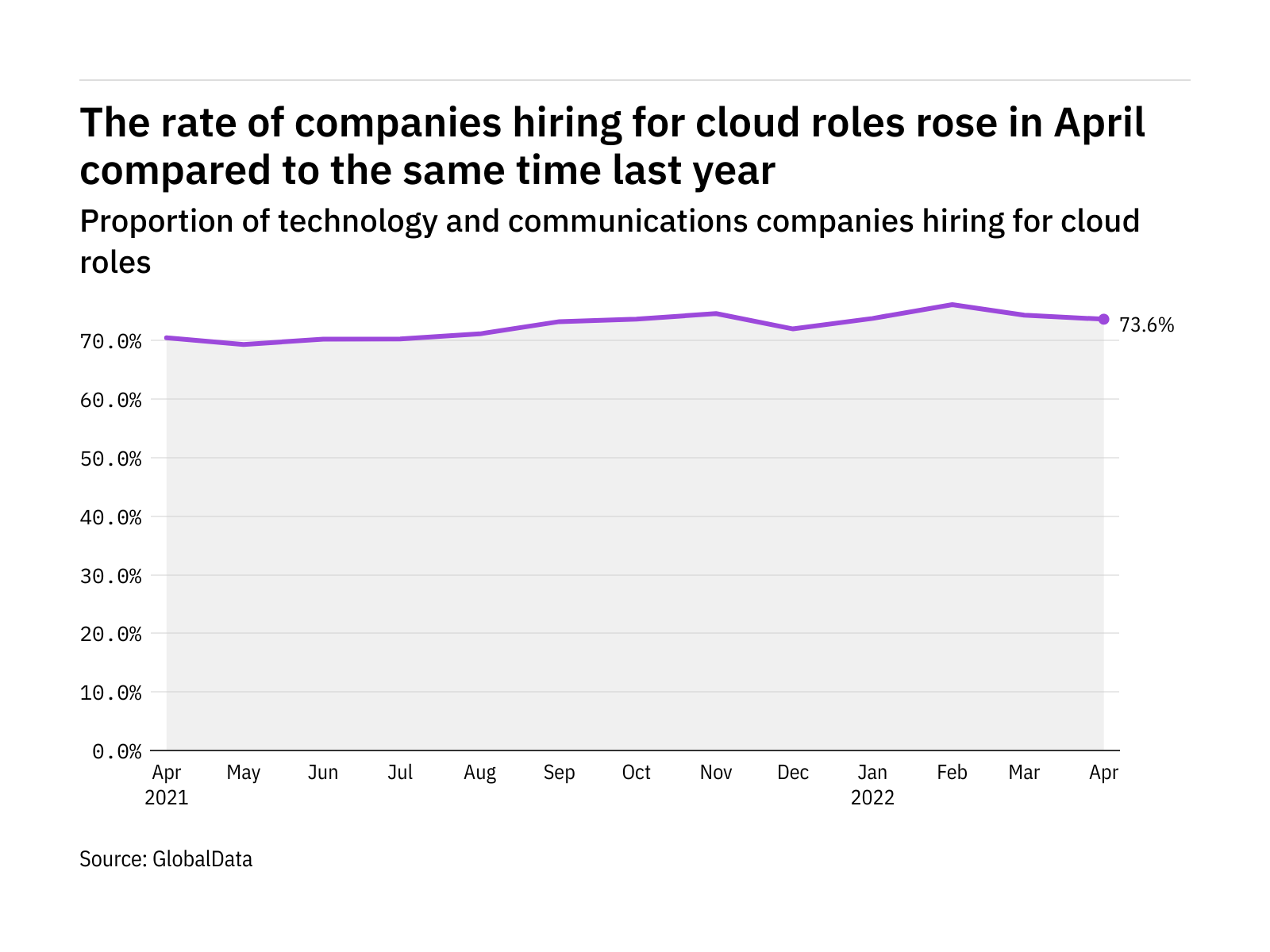 The proportion of technology and communications companies hiring for cloud related positions rose in April 2022 compared with the equivalent month last year, with 73.6% of the companies included in our analysis recruiting for at least one such position.