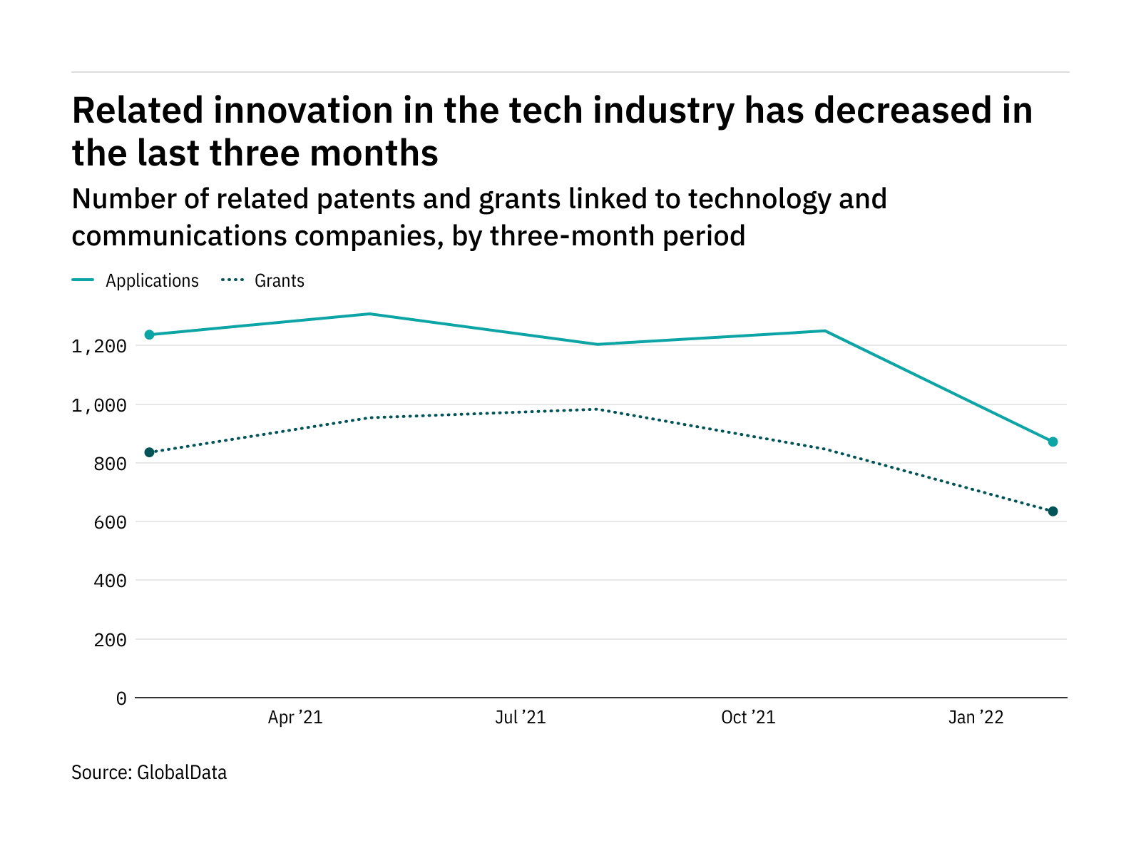 The most recent figures show that the number of related patent applications in the industry stood at 24176 in the three months ending May – down from 30326 over the same period in 2021.
