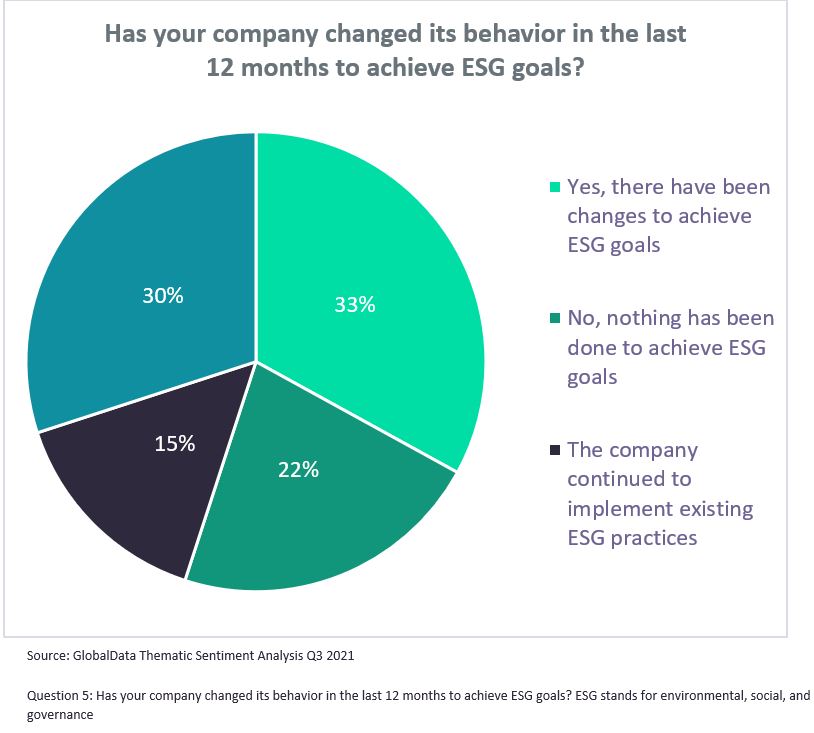 Most companies continue to behave as if environmental, social, and governance (ESG) issues do not concern them. According to a poll that GlobalData ran in Q3 2021, only 33% of businesses have changed their behaviour in the last year to achieve ESG goals. An additional 15% claimed that their companies continued to implement existing ESG practices. That means that less than half of the corporate world is taking some form of ESG action.