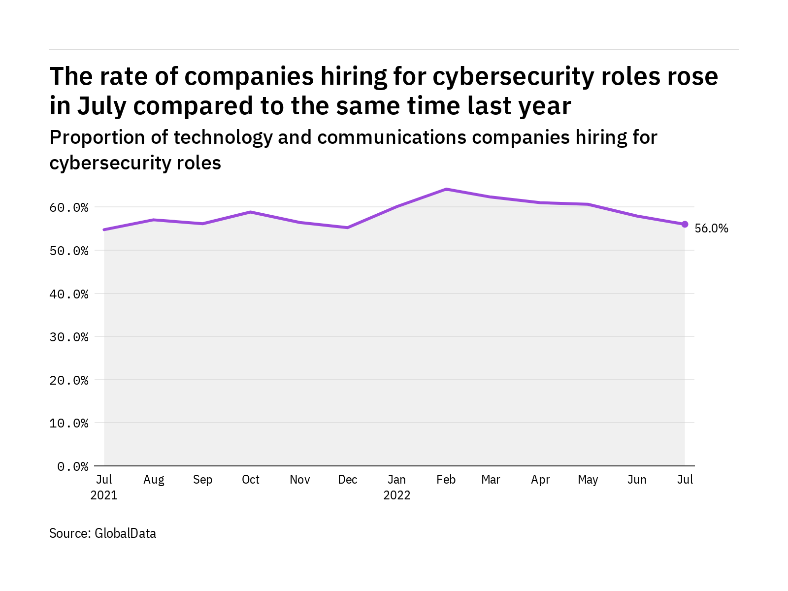 The proportion of technology and communications companies hiring for cybersecurity related positions rose in July 2022 compared with the equivalent month last year, with 56% of the companies included in our analysis recruiting for at least one such position.