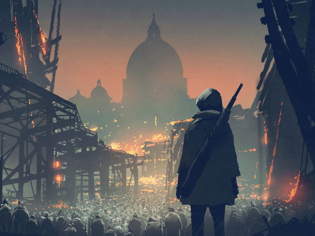 And the debris of delivery drones and air taxis litter the city after being “remotely hijacked to crash into crowds of innocents like fiery meteors”.