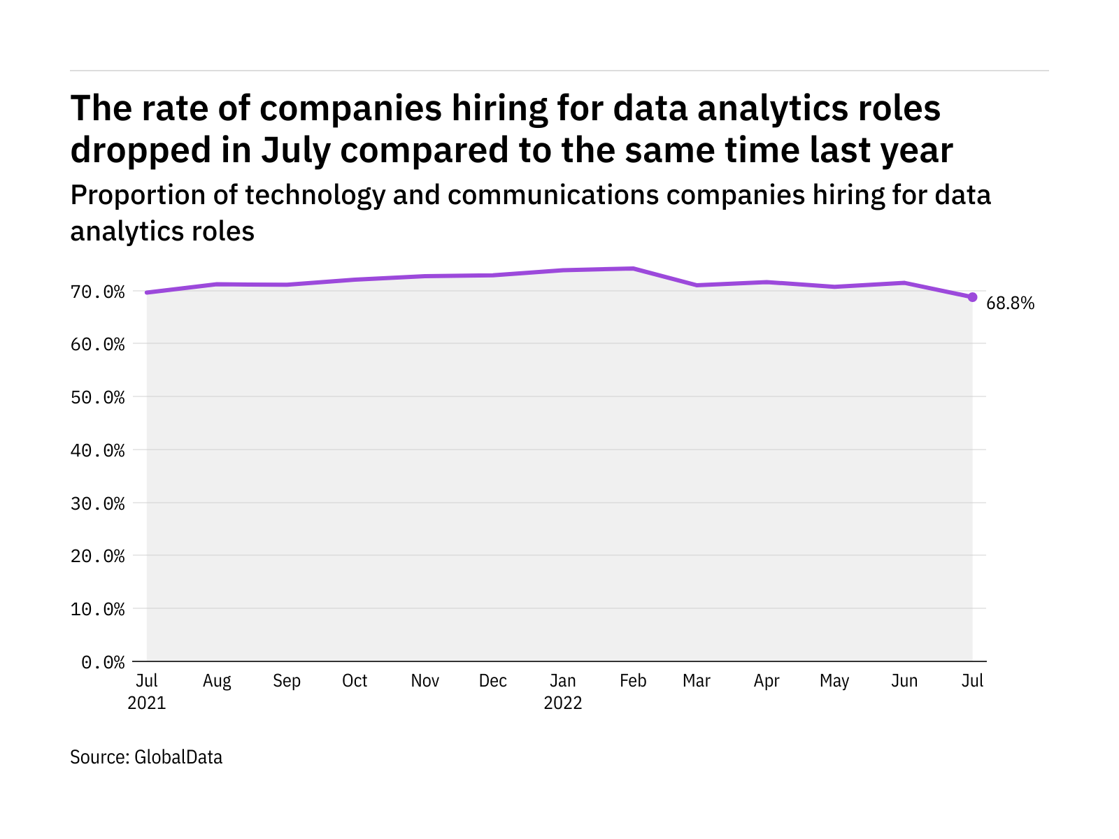 The proportion of technology and communications companies hiring for data analytics related positions kept relatively steady in July 2022 compared with the equivalent month last year, with 68.8% of the companies included in our analysis recruiting for at least one such position.
