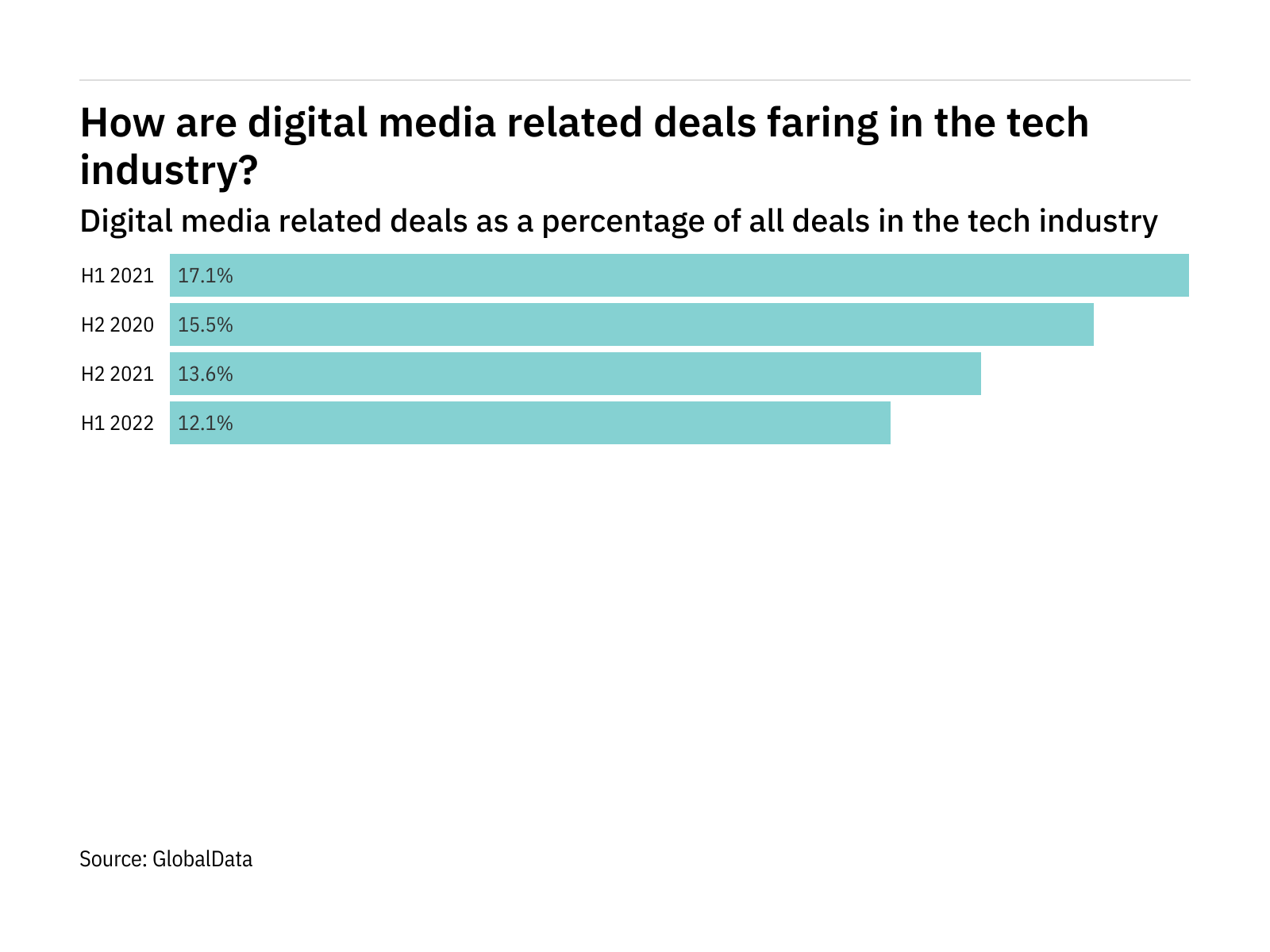 During first half of 2022, deals relating to digital media accounted for 12.1% of all deals taking place in the sector. This represents a decrease from the figure of 17.1% in the first half of 2021.