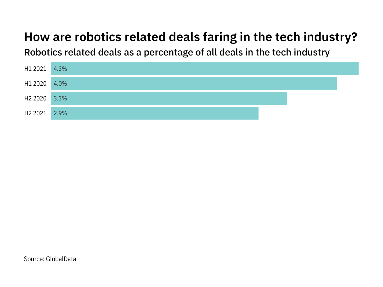During second half of 2021, deals relating to robotics accounted for 2.9% of all deals taking place in the sector. This represents a decrease from the figure of 3.3% in second half of 2020.