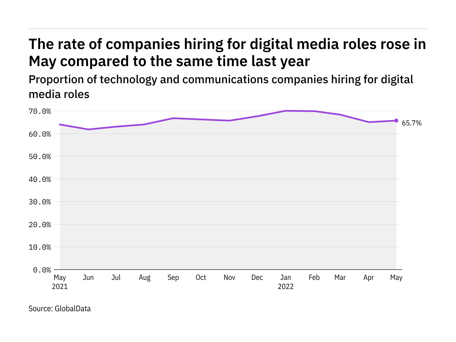 The proportion of technology and communications companies hiring for digital media related positions rose in May 2022 compared with the equivalent month last year, with 65.7% of the companies included in our analysis recruiting for at least one such position.