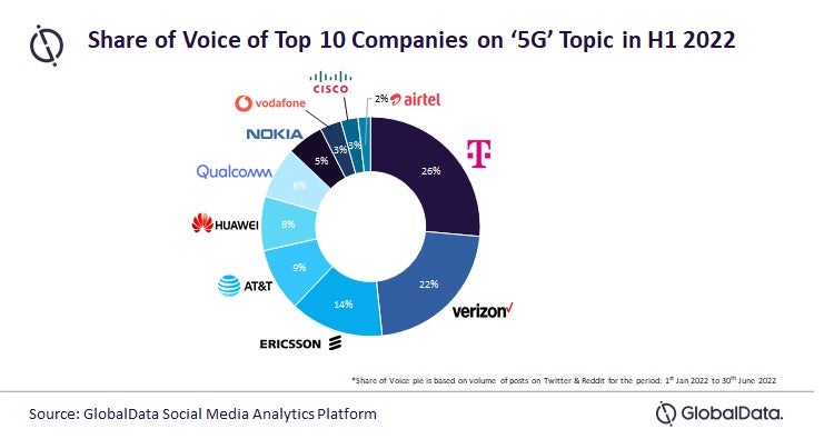 The Top 10 Most Mentioned Companies on 5G: H1 2022 report analyze the leading telecom service providers and infrastructure providers endorsing 5G network across the globe based on the volume of Social Media conversations, which are tracked by GlobalData’s Social Media Platform during the H1 2022 period.