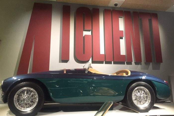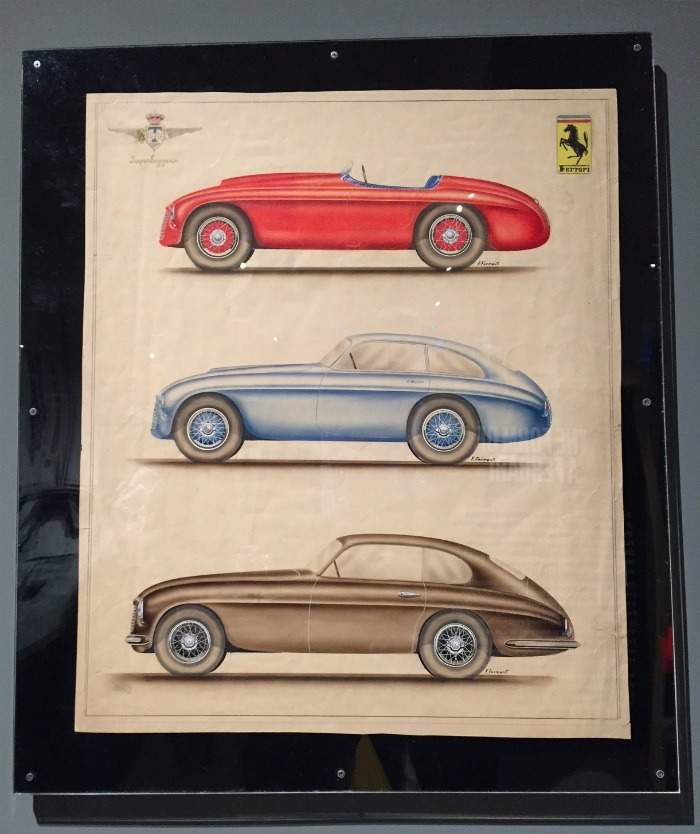 An abundance of photographs, sketches and information fill the walls, but the spotlights are on this replica Ferrari 125 S.