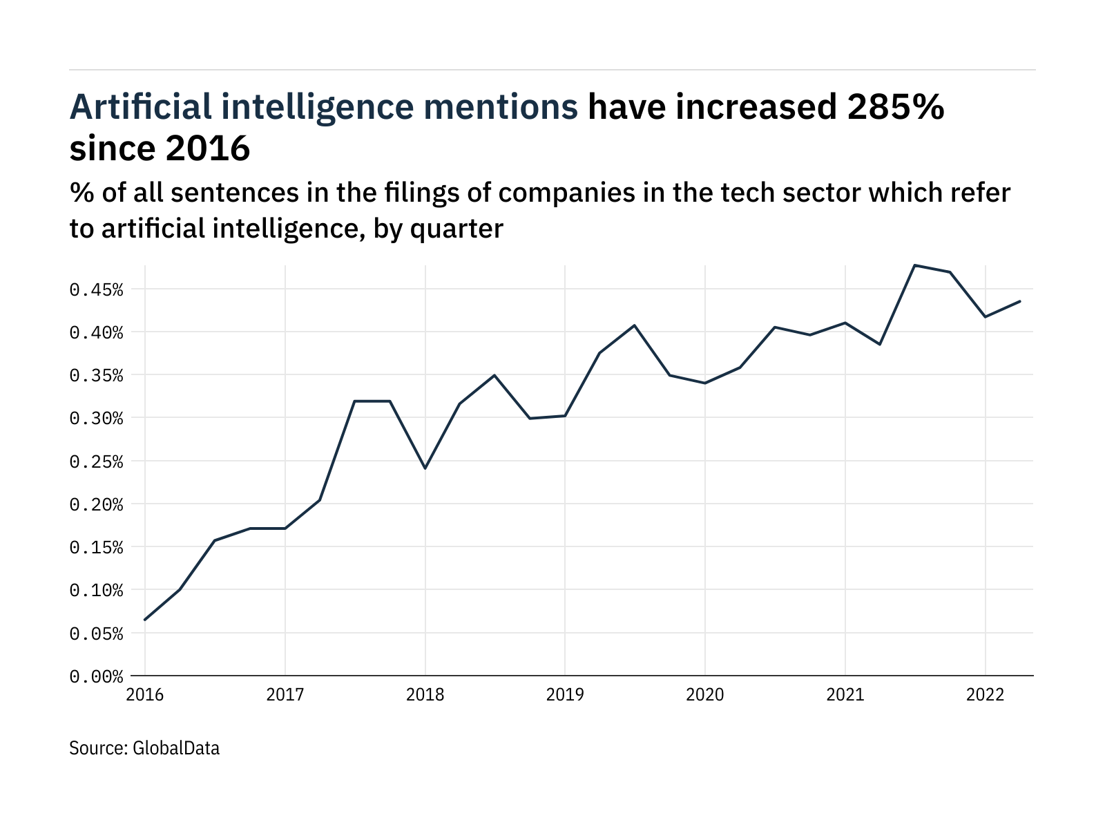 Mentions of artificial intelligence within the filings of companies in the tech sector were 285% higher between July 2021 and June 2022 than in 2016, according to the latest analysis of data from GlobalData.