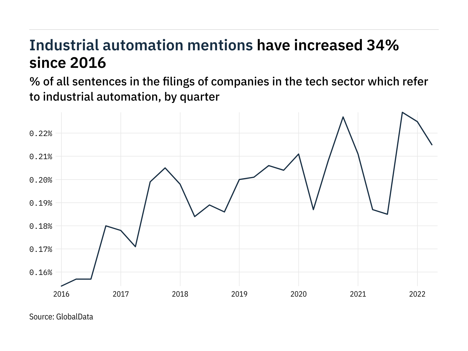 Mentions of industrial automation within the filings of companies in the tech sector were 34% higher between July 2021 and June 2022 than in 2016, according to the latest analysis of data from GlobalData.