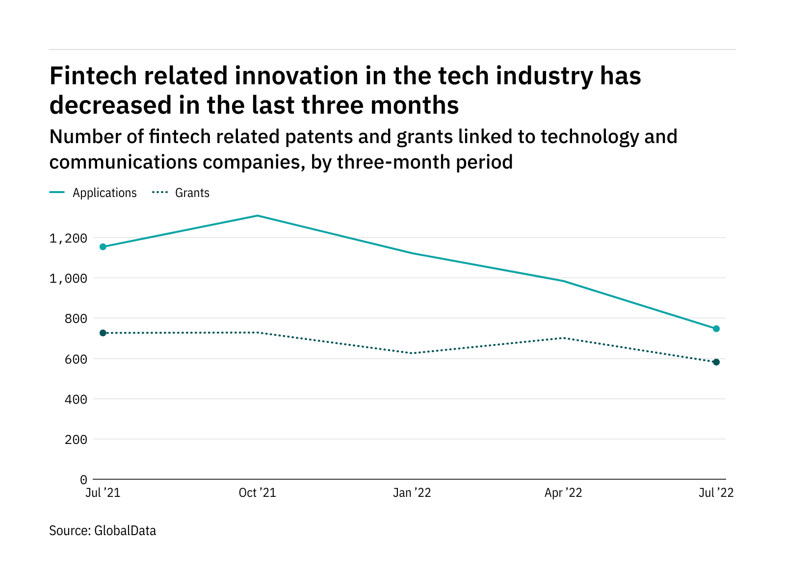 The most recent figures show that the number of fintech related patent applications in the industry stood at 748 in the three months ending July – down from 1155 over the same period in 2021.