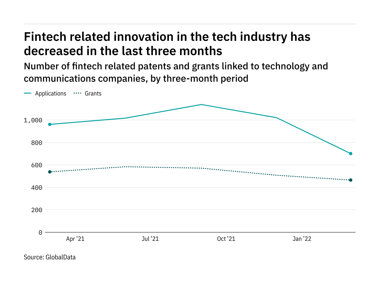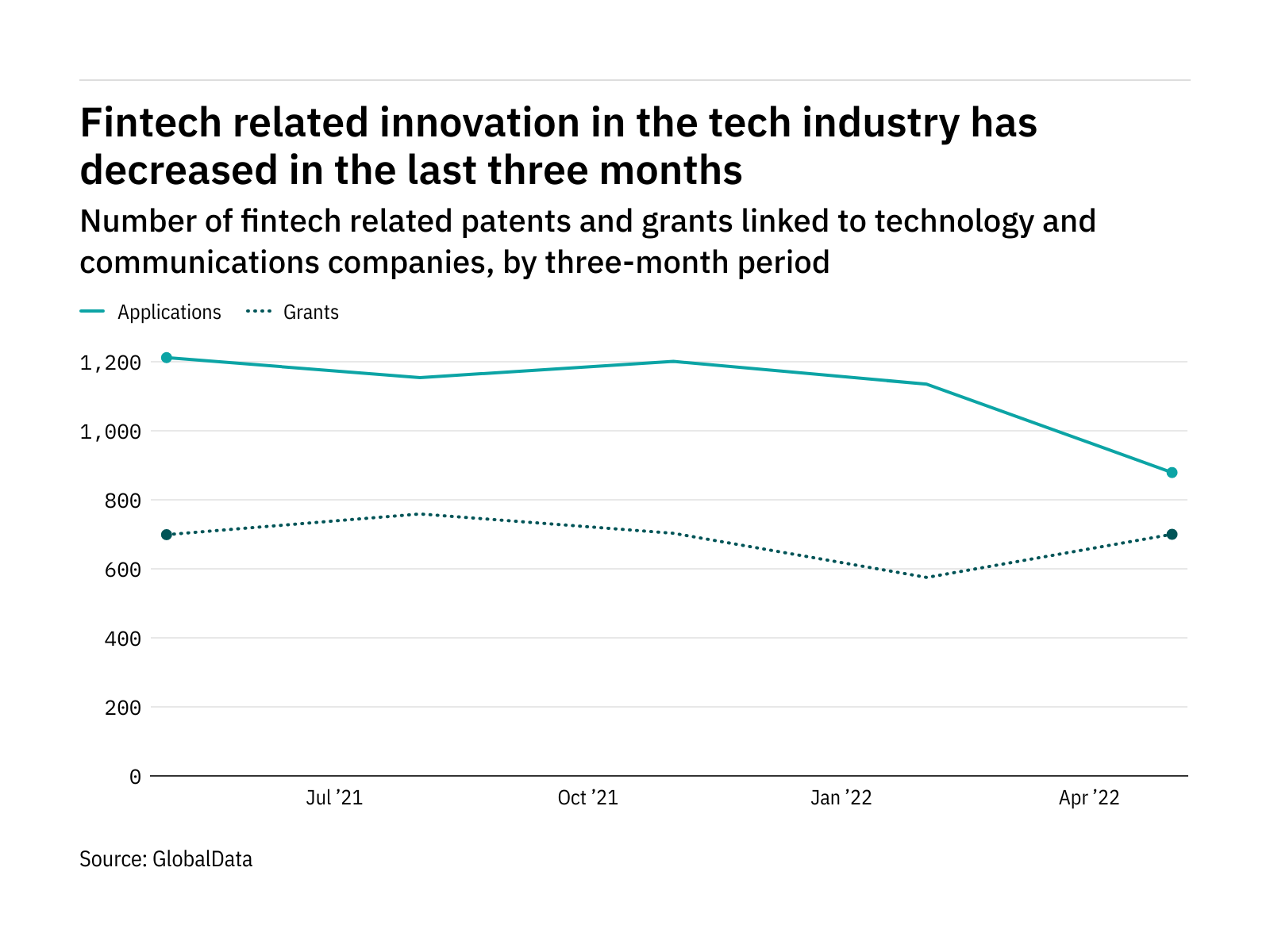 The most recent figures show that the number of fintech related patent applications in the industry stood at 879 in the three months ending May – down from 1,212 over the same period in 2021.