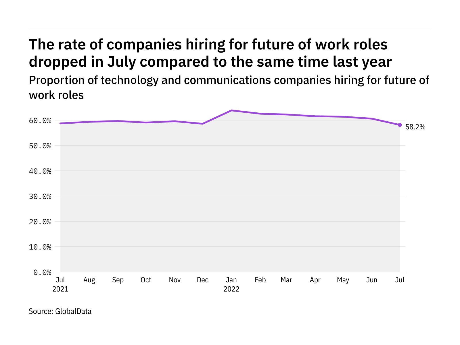 The proportion of technology and communications companies hiring for future of work related positions kept relatively steady in July 2022 compared with the equivalent month last year, with 58.2% of the companies included in our analysis recruiting for at least one such position.