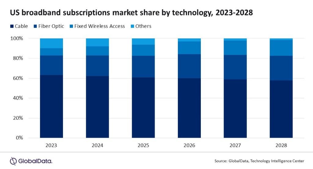The tech is expected to more than double its subscription market share in the US, expanding from a 7.2% share in 2023 to 15.8% in 2028. However, GlobalData’s updated report, “United States Fixed Communications Forecast,” reveals that despite its rapid adoption, FWA will remain in third place behind cable and fibre subscriptions in the US market.
