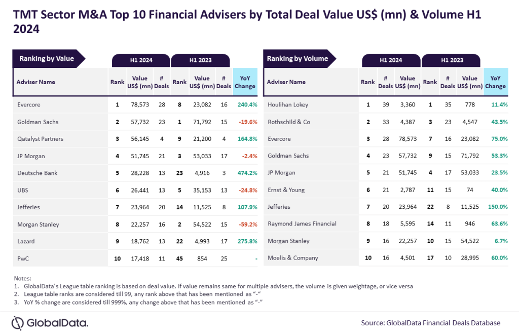 Evercore and Houlihan Lokey were the top mergers and acquisitions (M&A) financial advisers in the technology, media and telecom (TMT) sector during H1 2024, according to GlobalData’s latest league table.