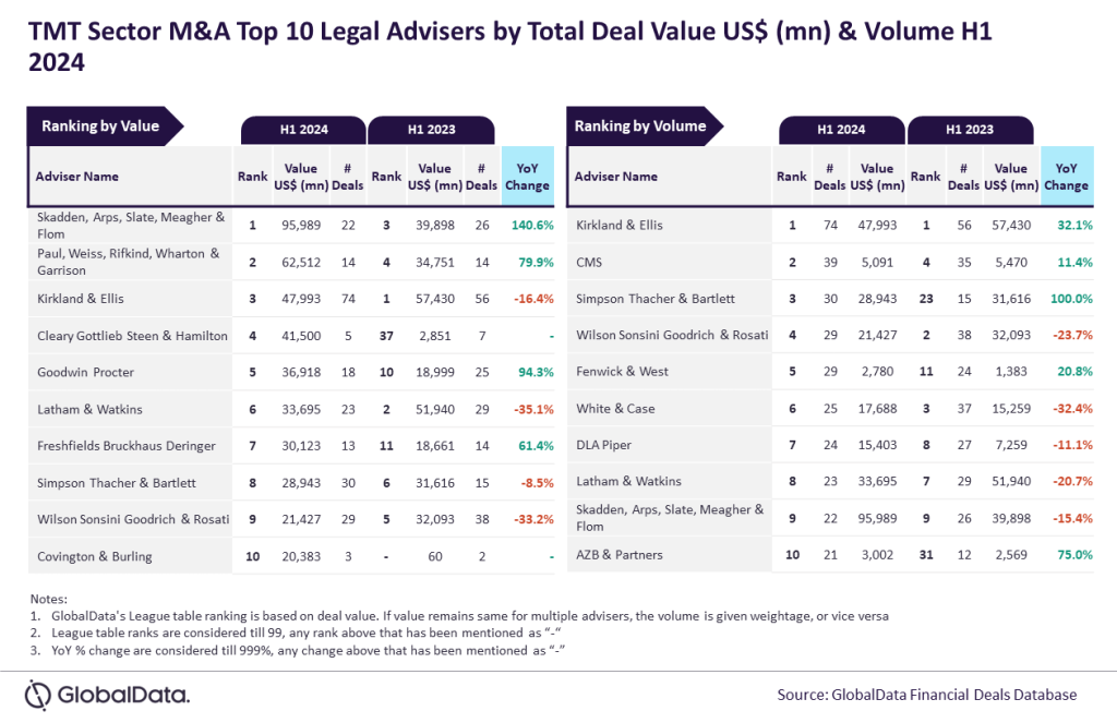 Among M&A legal advisers, Skadden, Arps, Slate, Meagher & Flom and Kirkland & Ellis led GlobalData’s rankings for H1 2024 in the TMT sector. Both firms outperformed their peers notably.