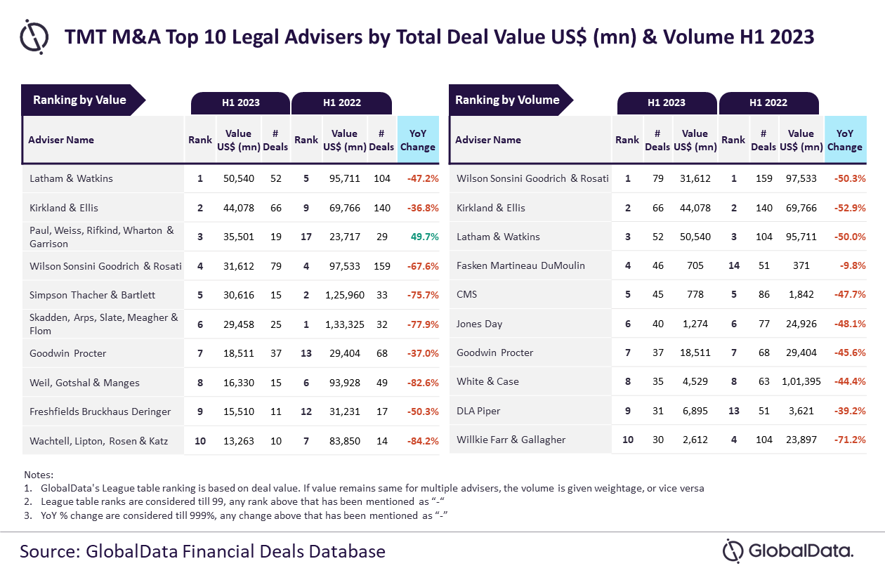 GlobalData’s latest league table of M&A advisers reveals a decline in the value and volume of deals advised on by the top ten legal advisers in the technology, media and telecom sector for H1 2023, compared to the same period last year.