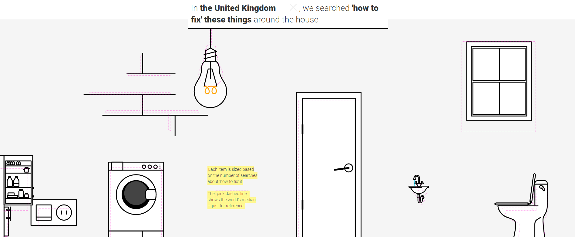 As you can see, we’re big on fixing things around the home in the UK. Compared to the median (that’s the little pink dashed lines around each item) we tend to Google how to fix these things a bit more than average.