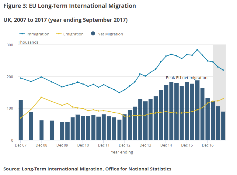 A total of 130,000 EU citizens left the UK in the year ending September 2017, compared to 103,000 in 2016. Many have put the numbers down to the UK’s decision to leave the EU – something it will formally do in March 2019.