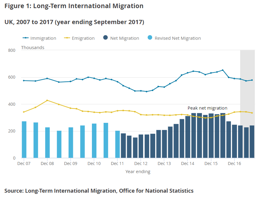 That said, the number of people arriving in the UK was larger than the number of people who left, with a total of 244,000 added to the population in 2017.