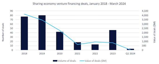 GlobalData’s 2024 thematic intelligence report into the sharing economy posited that VC investors were grappling with liquidity issues and high interest rates and that this may explain some of the decline in activity.