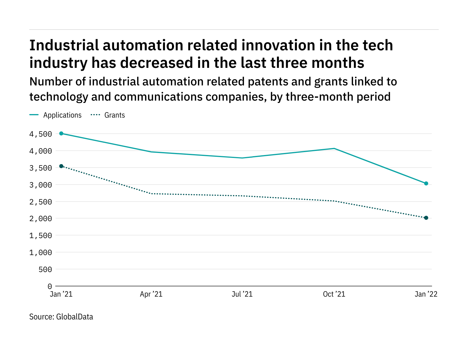 The most recent figures show that the number of industrial automation related patent applications in the industry stood at 3,662 in the three months ending April – down from 4,765 over the same period in 2021.