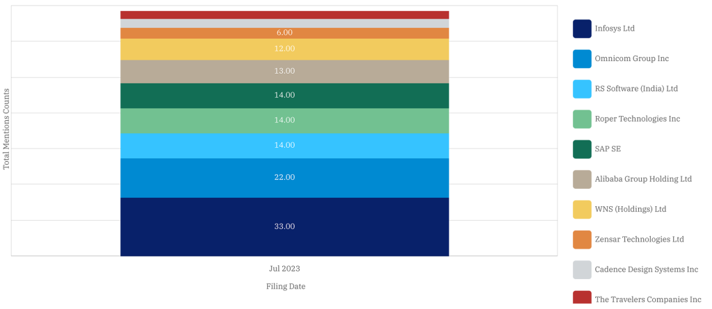 By GlobalDataUS marketing and communications company Omnicom Group ranked second in July 2023 for generative AI mentions with 22 mentions of the theme across all public filings captured by GlobalData. And India’s RS Software ranked third with 14 mentions of generative AI in July.
