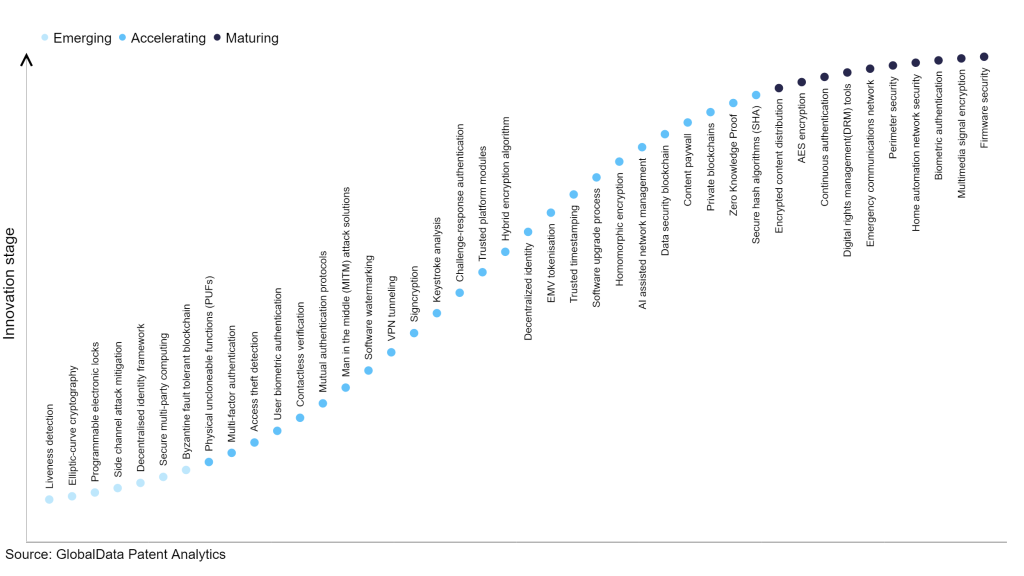 Within the emerging innovation stage, byzantine fault tolerant blockchain, secure multi-party computing, and decentralised identity framework are disruptive technologies that are in the early stages of application and should be tracked closely. Secure hash algorithms (SHA), zero knowledge proof, and private blockchains are some of the accelerating innovation areas, where adoption has been steadily increasing. Among maturing innovation areas are, firmware security, multimedia signal encryption, and biometric authentication, which are now well established in the industry.